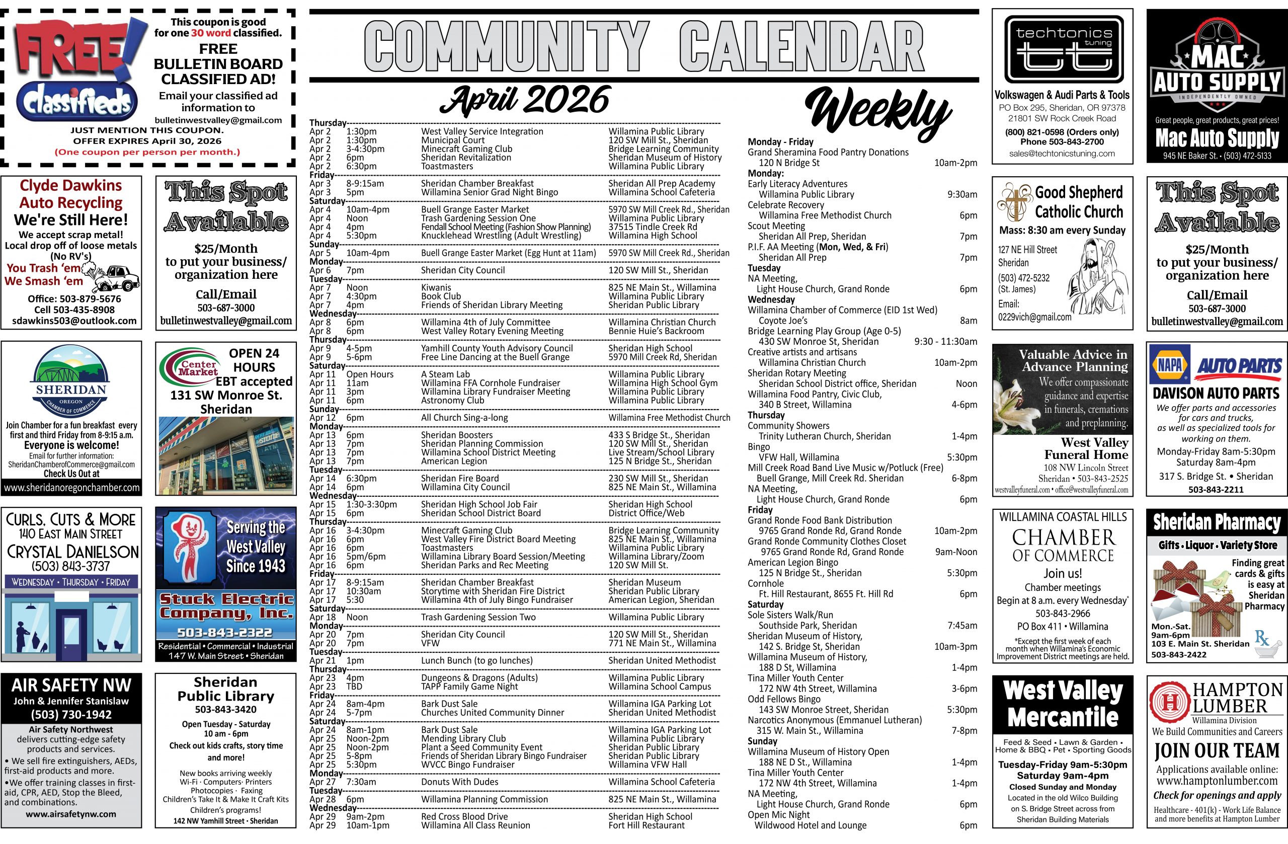 Put your event on the our community calendar (published the last issue of the month except when the 1st of the month falls on a Wednesday) and our long range calendar by emailing us directly or giving us a call at our contact information listed at the top of the page, or using the form below.